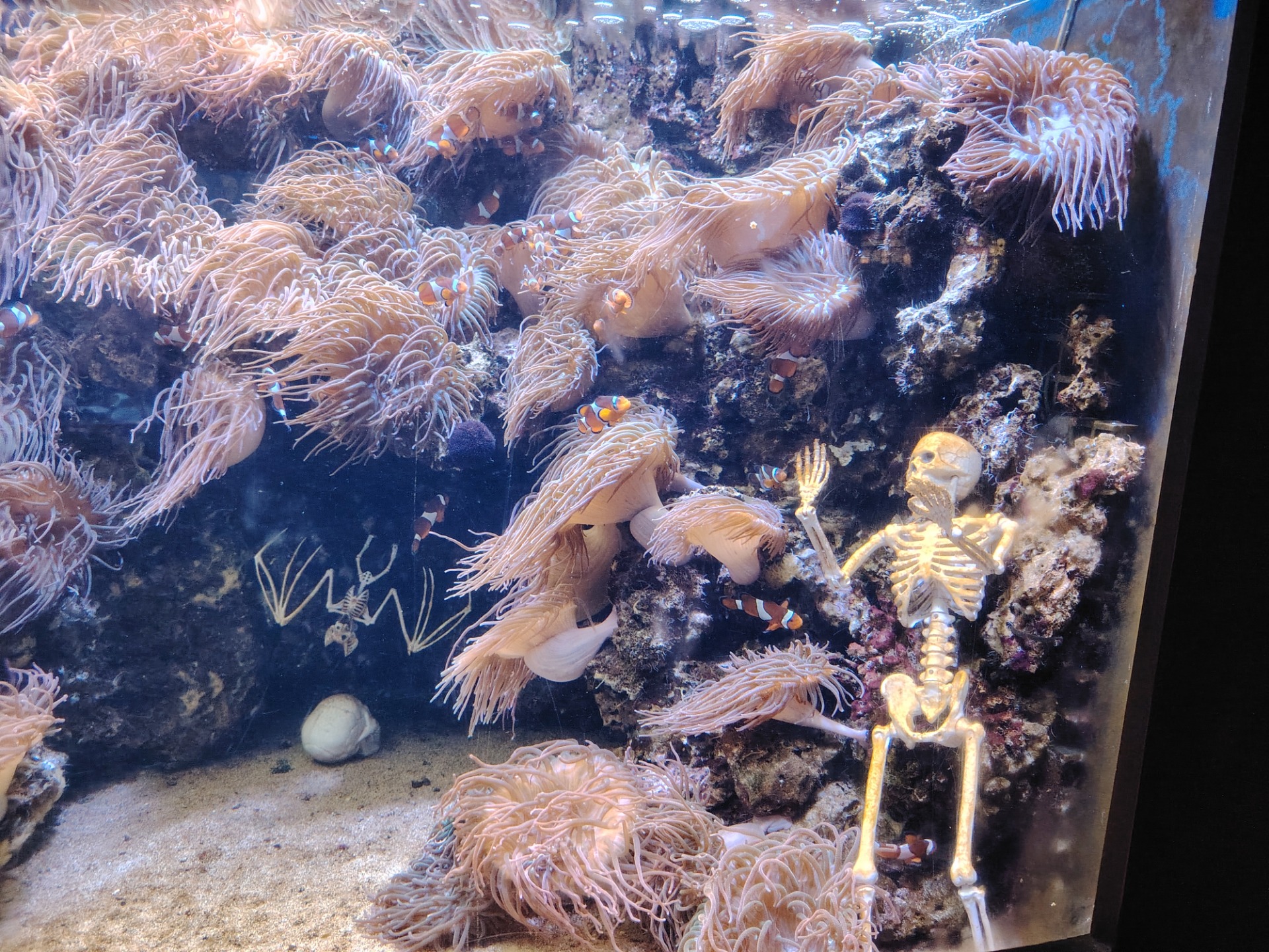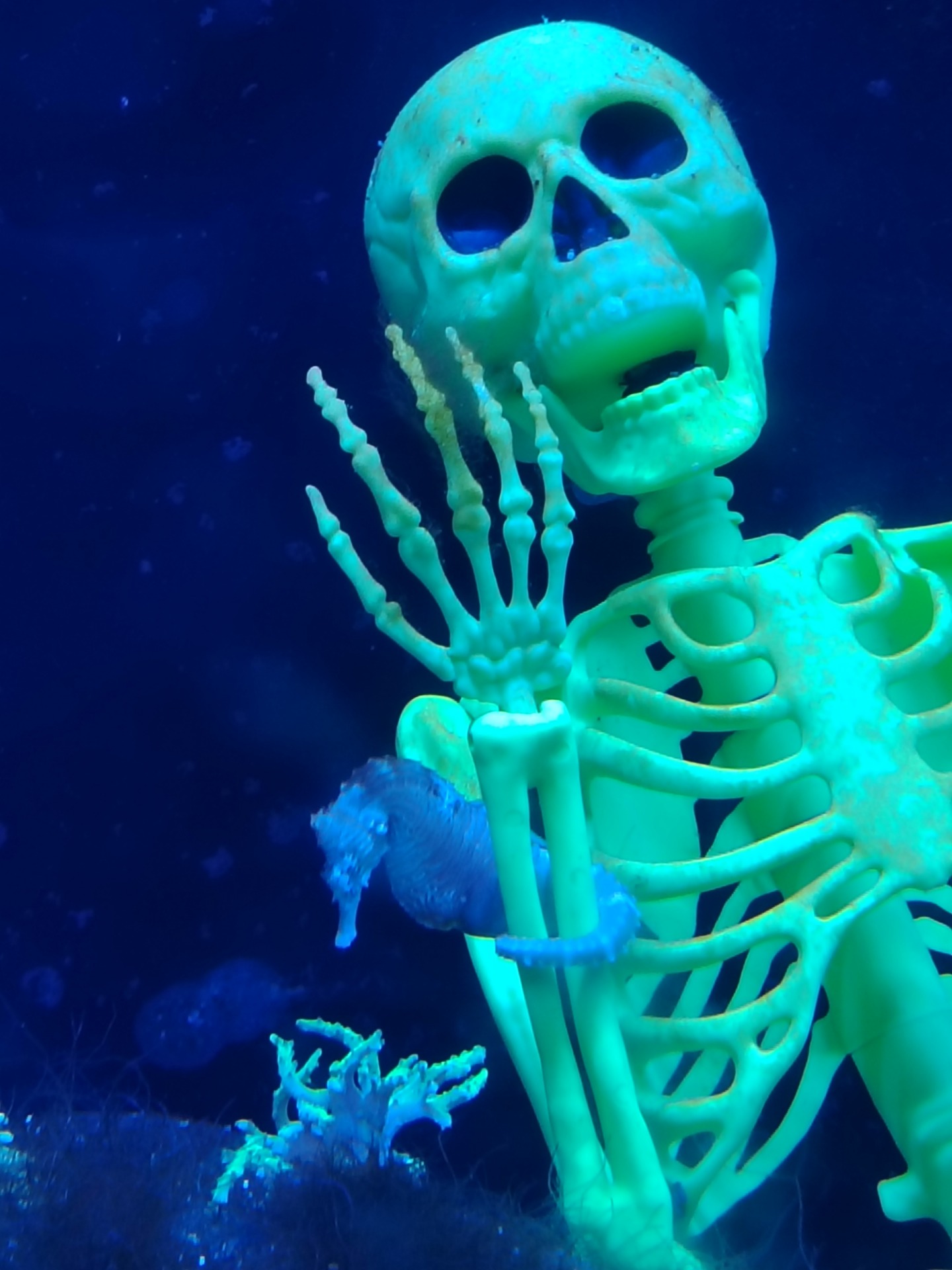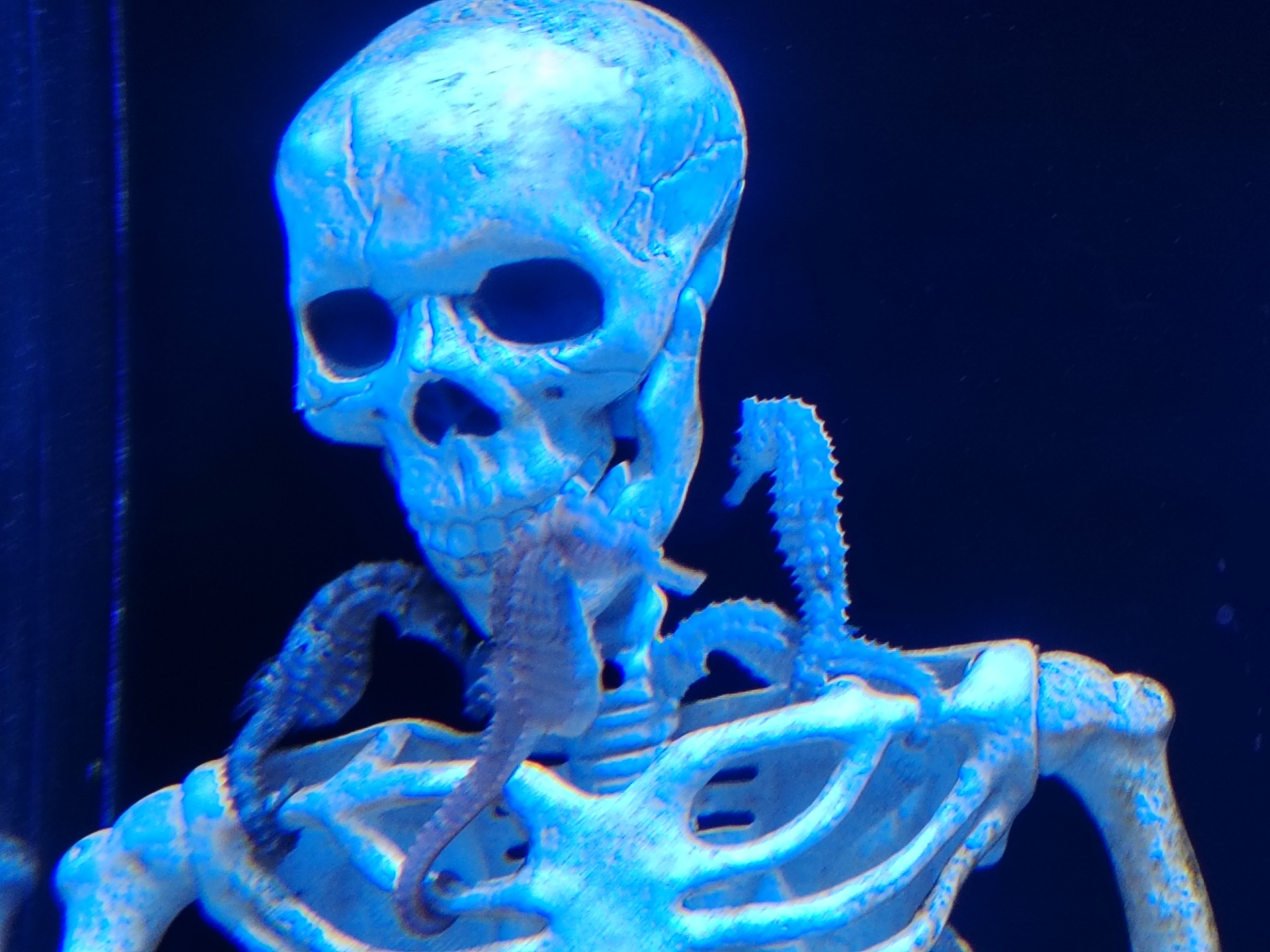 Toto místo si zvolit první den jako cíl se ukázalo jako strategicky velmi výhodné, protože jsem musela projít přes celou třídu Waikiki a přes většinu pláže Waikiki, takže jsem si užívala každou minutu nového vzduchu, tepla a faktu, že mám konečně vytouženou dovolenou. S čím jsem úplně nepočítala, tak byla skutečnost, že Halloween tu byl v plném proudu a ve většině akvárek byla aspoň jedna kostra, což mě nemělo překvapovat, ale jak jsem mohla tušit, že to bude i uvnitř akvárek? Navíc mořští koníci byli trochu moc zaangažovaní do těchto dekorací, toto je krásný příklad, kdy fotka mluví za tisíc slov.