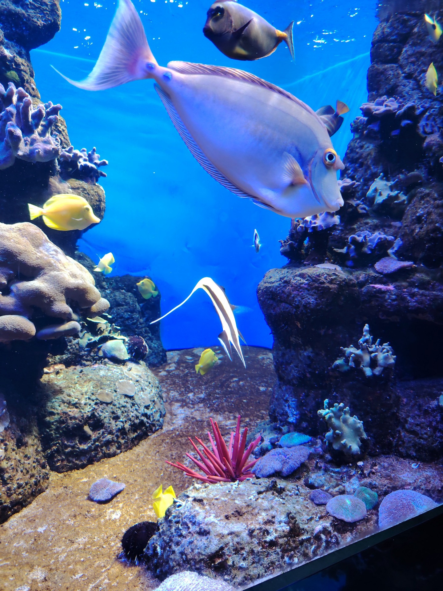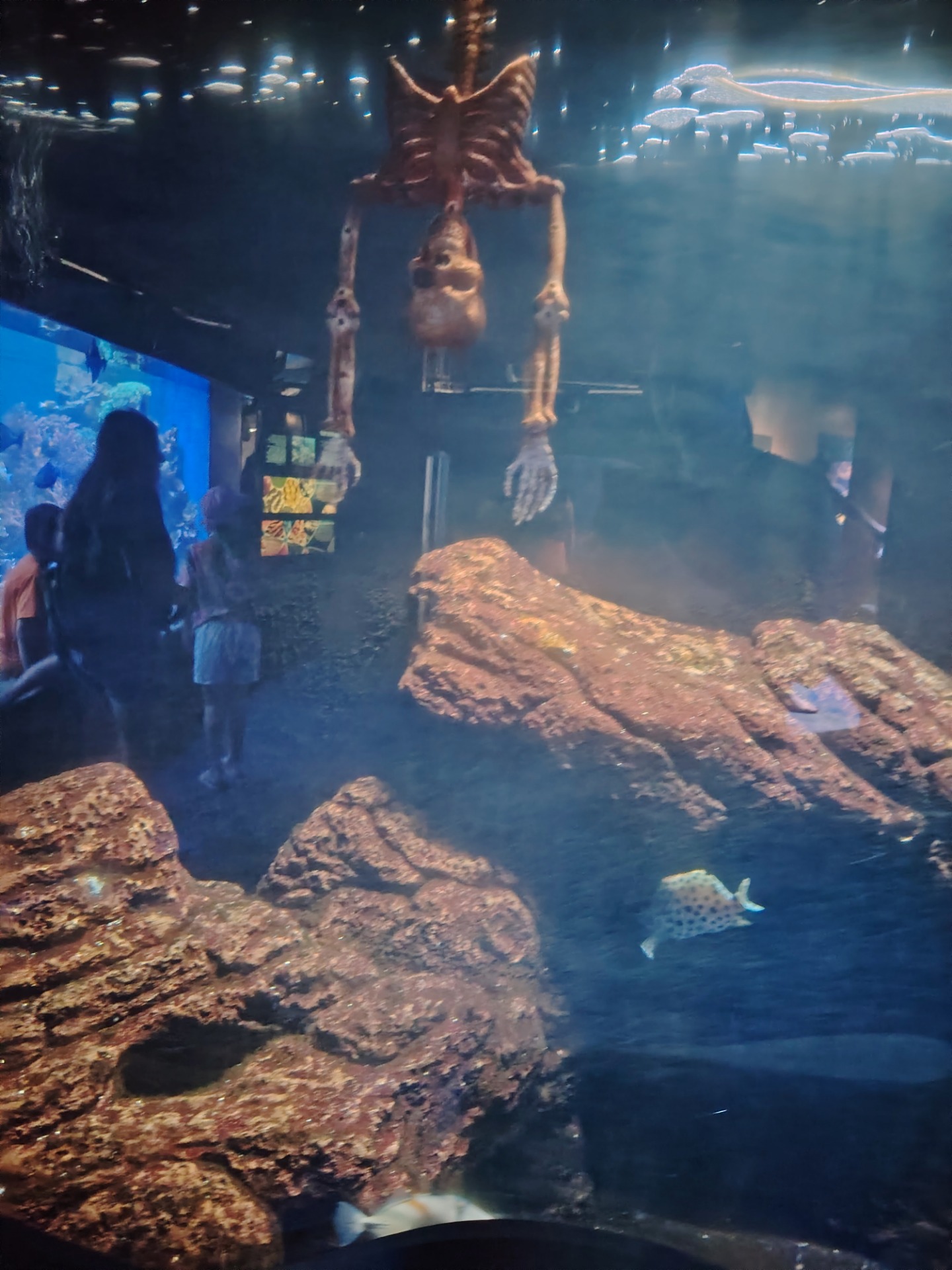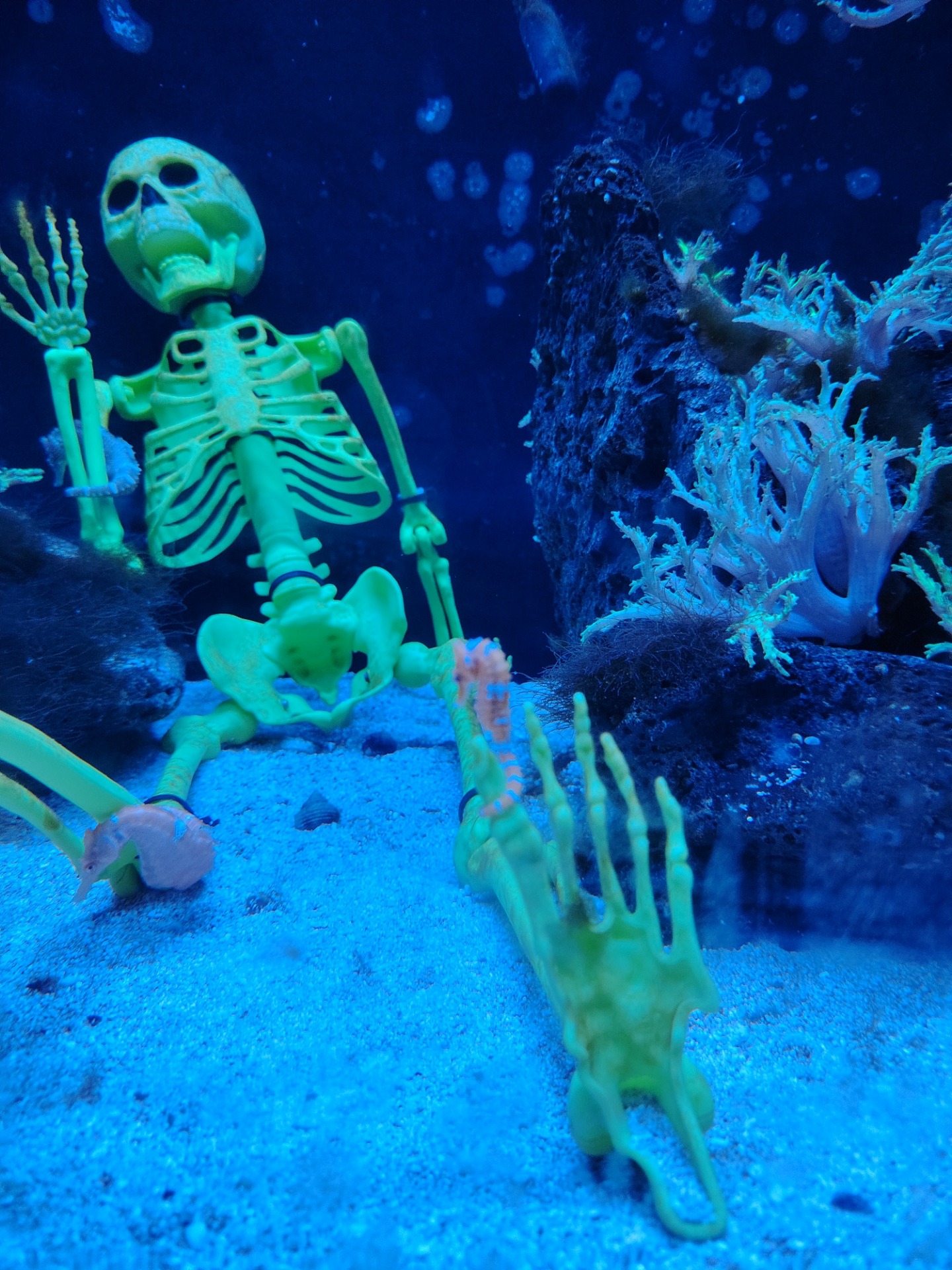 Toto místo si zvolit první den jako cíl se ukázalo jako strategicky velmi výhodné, protože jsem musela projít přes celou třídu Waikiki a přes většinu pláže Waikiki, takže jsem si užívala každou minutu nového vzduchu, tepla a faktu, že mám konečně vytouženou dovolenou. S čím jsem úplně nepočítala, tak byla skutečnost, že Halloween tu byl v plném proudu a ve většině akvárek byla aspoň jedna kostra, což mě nemělo překvapovat, ale jak jsem mohla tušit, že to bude i uvnitř akvárek? Navíc mořští koníci byli trochu moc zaangažovaní do těchto dekorací, toto je krásný příklad, kdy fotka mluví za tisíc slov.