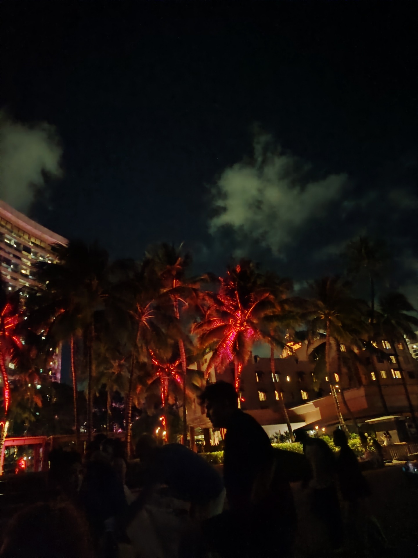 Každý pátek večer se konají ohňostroje v jednom hotelu ve Waikiki, takže se na všech plážích, kde je něco vidět, shromáždí neskutečné množství lidí a pozorují tuto zajímavou show. Naneštěstí pro mě jsem si vybrala špatnou pláž, takže mi ve výhledu bránila budova jednoho hotelu, ale i tak to byl zajímavý zážitek. Především zažít osvětlenou Waikiki, navíc na Halloween. Já masky moc nefotila, přestože jsem se nemohla rozhodnout, co fotit dřív, ale povedlo se mi vyfotit jedno auto.
